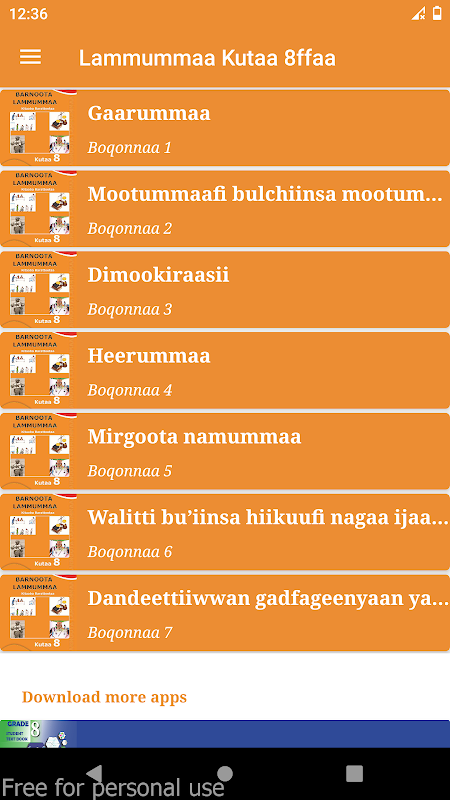 Ứng dụng này cung cấp cho các nhà giáo dục ở Ethiopia quyền truy cập vào Sách giáo khoa Giáo dục Công dân và Đạo đức Lớp 8 cho học sinh, được gọi là Afaan Oromoo (Lammummaa). Sách giáo khoa được trình bày dưới dạng sách điện tử tiện lợi, giúp Học sinh dễ dàng truy cập và sử dụng tài liệu trên điện thoại thông minh hoặc máy tính bảng của mình.