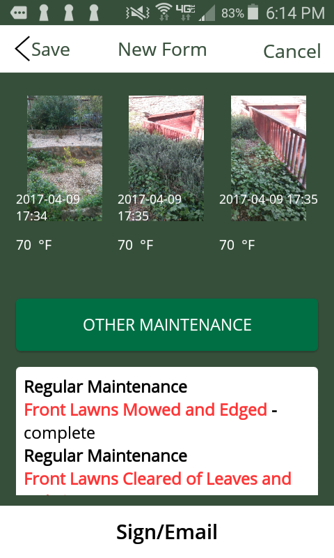 The Landscape Maintenance Application provides a consistent, streamlined documentation and signoff process for field workers to use from beginning of work to signoff. It leverages smartphone technology with our patent-pending, time-locked documentation process that includes embedded photos watermarked with time, date, ambient temperature, and GPS location, in addition to sorting, storing, and emailing documents and enabling signature capture (E-Sign) with Cloud syncing on multiple devices (iOS).
