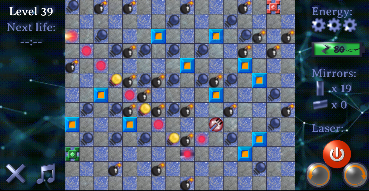 In this 2D puzzle game you're an experimental physicsts and its on you to build up an setup to activate all the lamps on the table by hitting the with a laser beam. Unfortunately, they are distributed over the whole map. Hence, you have to place different type of mirrors at the correct spots on the map in order to redirect the laser beam and hit the lamps. But since this alone would be too easy, different kind of objects like bombs, gates and blocks make this whole process a way more difficult, so you have to think twice (or more) before you activate the laser...
