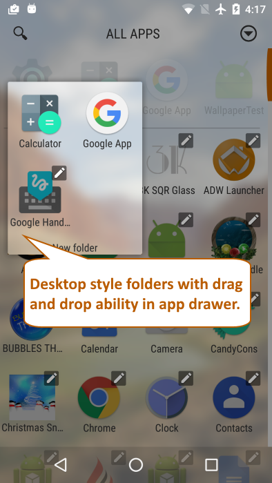 ♦App drawer folders - Lpp supports desktop style folders in app drawer. You can drag items in an out of it easily.