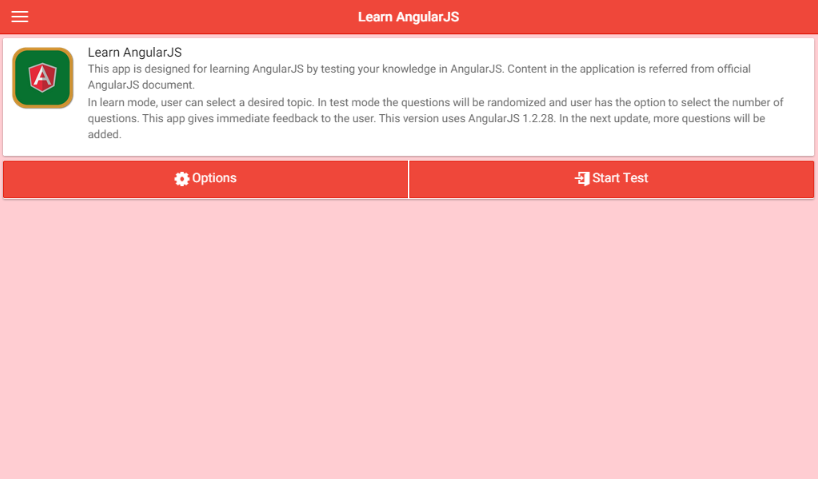 Content in the application is referred from official AngularJS document. This version uses AngularJS 1.2.28. In the next update, more questions will be added.