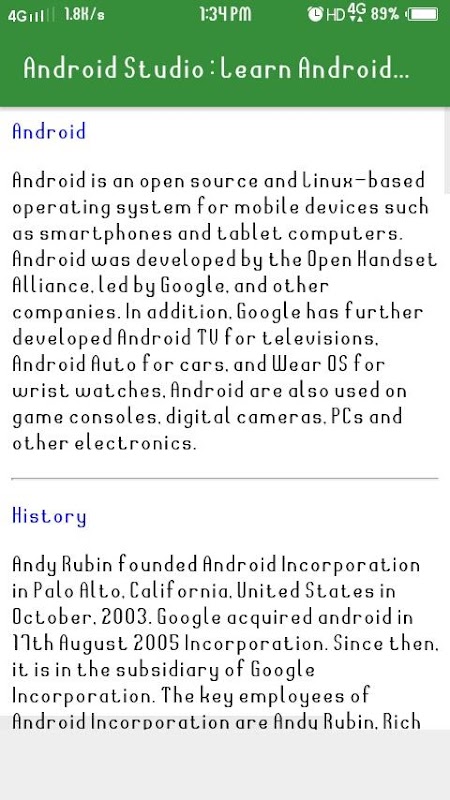 Android Studio Learning Tutorial is one of a kind Android Application that includes Tutorials, Examples of Code with Demo, Quiz and Interview Questions.