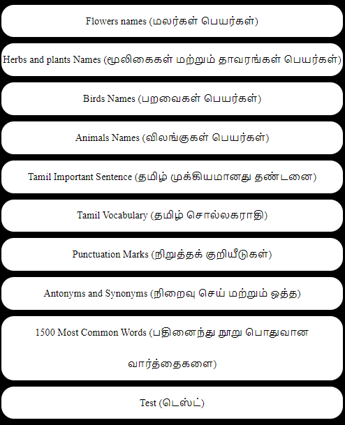 Các từ tiếng Tamil thuộc nhiều danh mục hữu ích như Động vật, Chim, Trái cây, Rau, Màu sắc, Con người, Con số, Bảng chữ cái và Câu có thể dễ dàng học từ vựng tiếng Tamil quan trọng từ tiếng Anh.