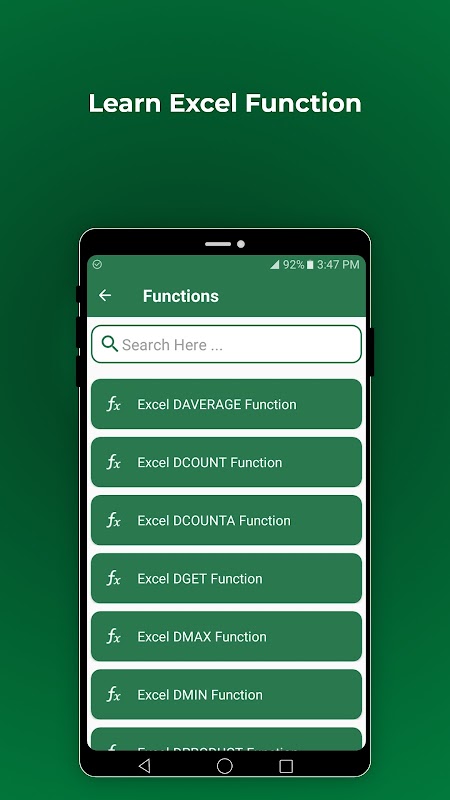 Ứng dụng EXCEL Formulas là “Ứng dụng ngoại tuyến EXCEL Formulas” miễn phí, có nhiều tính năng giúp ứng dụng trở thành một trong những Ứng dụng Tốt nhất. Đây là ứng dụng miễn phí, bạn có thể dễ dàng tìm kiếm bất kỳ công thức và hàm nào của MS-Excel.