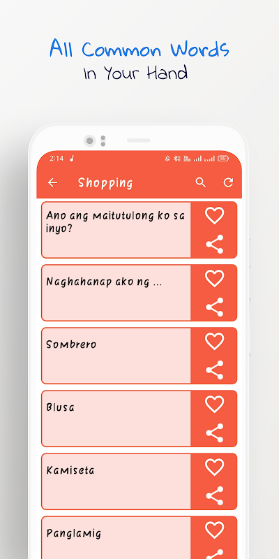 Ứng dụng học tiếng Philippines cho người mới bắt đầu có 27 phần khác nhau. Đó là ~ trường học, công việc, động vật, các môn thể thao, phỏng vấn, thẩm vấn, câu thường gặp, khách sạn, ngày tháng, các vấn đề, nhà hàng, xe hơi, màu sắc, con số, bác sĩ, chỉ đường, phương tiện giao thông, thân hình, thời gian, cảm xúc, thị trường, du lịch và thiên nhiên, giới thiệu, thời tiết, chiêm tinh, lời chào và mua sắm. Các danh mục là đủ cho hầu hết các câu bạn cần học trong những tình huống và địa điểm này.