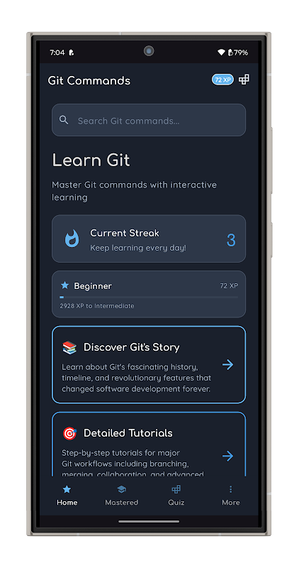 Nâng cao kỹ năng Git của bạn từ người mới bắt đầu lên chuyên gia với các bài học tương tác, câu đố, tình huống thực tế và trải nghiệm học tập trò chơi. Cho dù bạn là sinh viên, nhà phát triển hay trưởng nhóm, ứng dụng học tập Git tất cả trong một này giúp bạn làm chủ kiểm soát phiên bản theo tốc độ của riêng bạn — ngoại tuyến và không có quảng cáo.