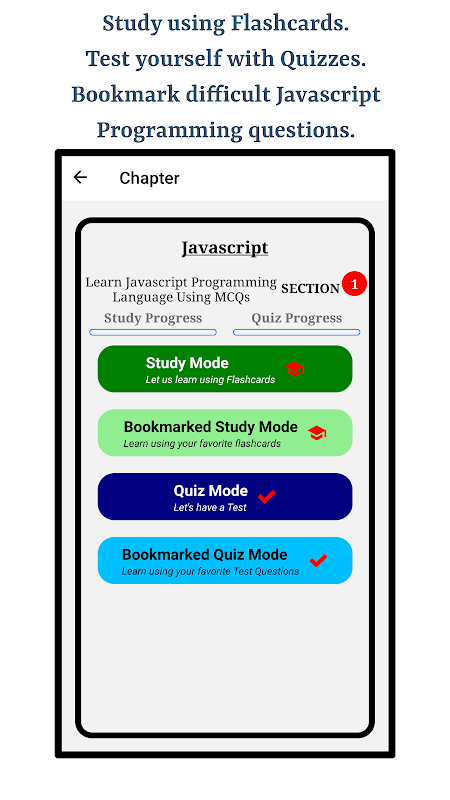 Ứng dụng này là một nguồn tuyệt vời để tìm hiểu về Ngôn ngữ lập trình Javascript. Ứng dụng này được thiết kế để giúp người dùng hiểu hoàn hảo các câu hỏi phổ biến về Ngôn ngữ lập trình Javascript bằng cách nghiên cứu trong một khoảng thời gian rất ngắn. Chức năng âm thanh và đánh dấu trang có sẵn trong ứng dụng trên chương, phần, chế độ học tập và chế độ đố vui.