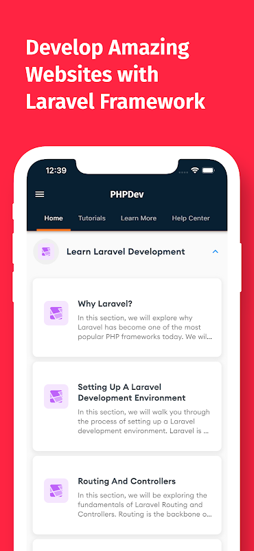 Ứng dụng của chúng tôi bao gồm các hướng dẫn toàn diện về lập trình PHP và khung Laravel, cũng như các khái niệm phát triển web như HTML, CSS và JavaScript. Cho dù bạn là người mới bắt đầu hay một lập trình viên có kinh nghiệm, ứng dụng của chúng tôi đều có thứ dành cho tất cả mọi người.