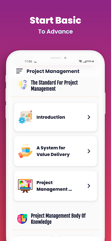 Tìm hiểu các bài giảng, hướng dẫn, Câu đố về Quản lý dự án và nhiều nội dung khác trong ứng dụng.