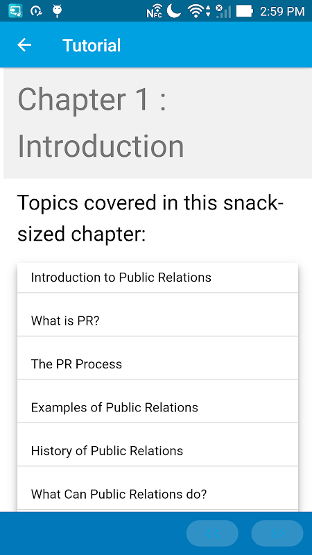 You have limited access to the content provided. For full access to the content, please login and purchase this application. This app provides a quick summary of essential concepts in Public Relations by following snack sized chapters: