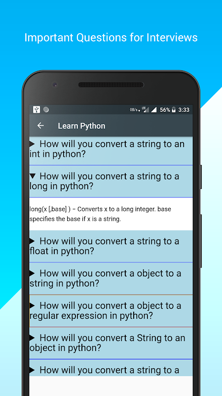 Nó là một gói đầy đủ cho lập trình Python. Nó chứa các hướng dẫn để học, mcq để kiểm tra kiến thức của bạn, câu hỏi mã hóa để cải thiện logic của bạn và làm quen với kiểu mã hóa Python và cuối cùng nhưng không kém phần phiên dịch nhẹ để bạn có thể thực hành lập trình Python khi bạn học.