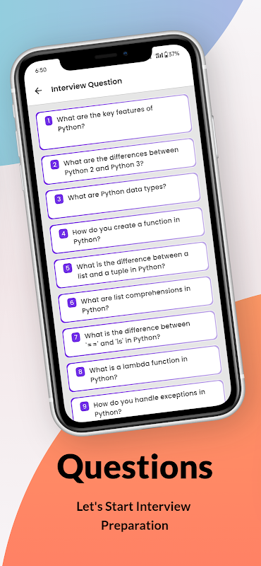 Chuẩn bị cho một cuộc phỏng vấn liên quan đến Python? Chúng tôi đã cung cấp cho bạn một ngân hàng câu hỏi phỏng vấn phong phú. Từ các câu hỏi thường gặp đến các thử thách giải quyết vấn đề nâng cao, ứng dụng của chúng tôi đảm bảo bạn sẵn sàng gây ấn tượng với người phỏng vấn.