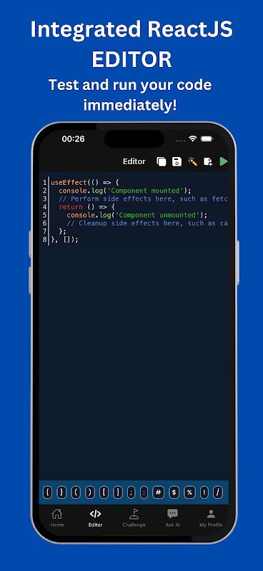 Trình soạn thảo JavaScript và Trình soạn thảo TypeScript tích hợp: Học viện React đi kèm với một IDE được tích hợp ngay trong ứng dụng, cho phép bạn viết, kiểm tra và chạy mã React trực tiếp từ thiết bị di động của mình. Với trình soạn thảo JavaScript và trình soạn thảo TypeScript thân thiện với thiết bị di động này, bạn có thể viết mã mọi lúc, mọi nơi mà không cần máy tính.
