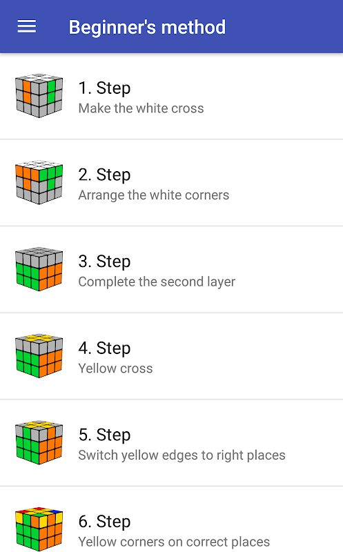 This simple app helps you to solve rubiks' cube with either the beginner's method or the most popular speedcubing method, Fridrich method (CFOP).