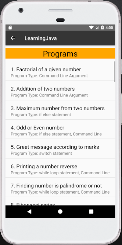 Ứng dụng này cung cấp các hướng dẫn được biên soạn và an ủi. Đồng thời, nó cung cấp các chương trình bổ sung và nền tảng mã hóa duy nhất cho người dùng Java, nơi người học có thể viết và chạy các chương trình riêng và kiểm tra các kỹ năng lập trình riêng của mình như người học. Các bài kiểm tra sẽ giúp người học tự đánh giá bản thân trong suốt ứng dụng này. Ngoài ra ứng dụng này sẽ được hỗ trợ cho bất cứ ai chuẩn bị cho các cuộc phỏng vấn của công ty hoặc cho kỳ thi tuyển sinh thông qua các câu hỏi phỏng vấn được cung cấp trong ứng dụng này.