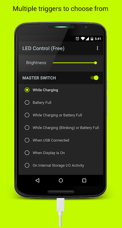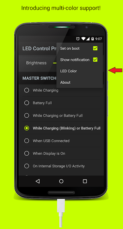 Sử dụng ứng dụng này để chọn hạt nhân cụ thể "sạc gây nên" cho LED của thiết bị sẽ làm cho nó sáng lên khi cắm vào tùy thuộc vào những nguyên nhân cụ thể sạc.