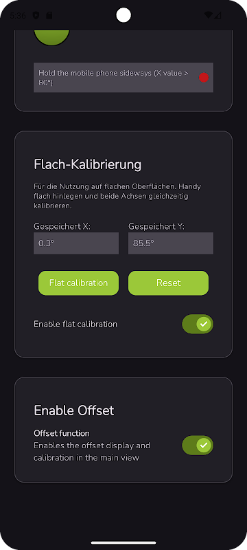 Chế độ xem kép cho phép đo chính xác: Chế độ xem chính hiển thị cả giá trị độ nghiêng theo chiều ngang và chiều dọc theo thời gian thực. Chỉ cần đặt hoặc đặt điện thoại di động xuống, bạn sẽ thấy góc ngay lập tức. Bạn có thể di chuyển các hình ảnh hiển thị tự do trên màn hình và nếu cần, hãy khóa trục ngang hoặc trục dọc để chỉ cố định một trục.