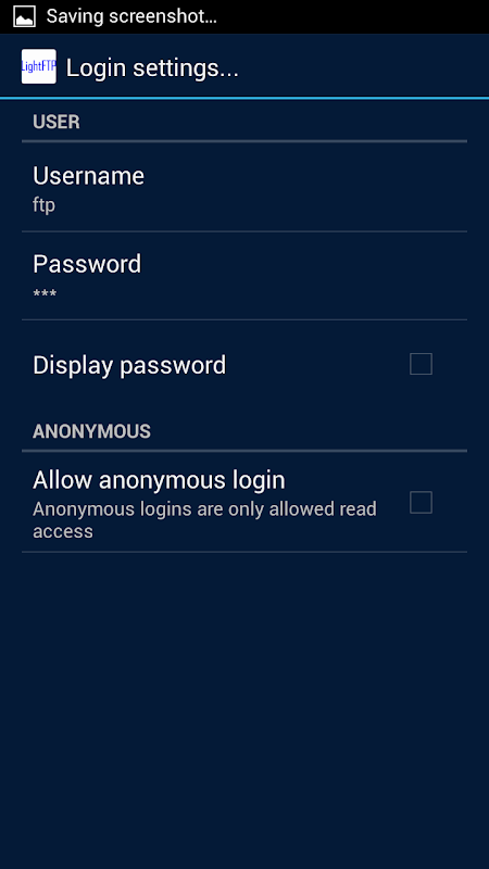 Light FTP server enable Android device act as standard FTP server. Light FTP server enable you to control your device files remotely over WIFI/LAN. You can use standard FTP clients/browser to connect to your Light FTP server.