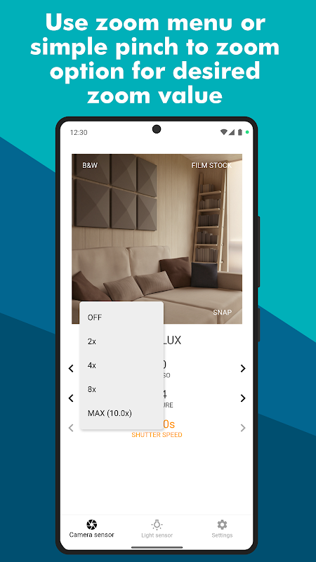 Đồng hồ đo ánh sáng là ứng dụng giúp bạn tính toán cài đặt độ phơi sáng phù hợp theo hai cách, sử dụng camera chính của điện thoại hoặc cảm biến ánh sáng xung quanh phía trước. Bạn chỉ cần cài đặt độ nhạy sáng ISO của phim đang sử dụng và đặt giá trị khẩu độ mong muốn và ứng dụng sẽ tính toán lại tốc độ màn trập cho bạn, đơn giản như vậy.