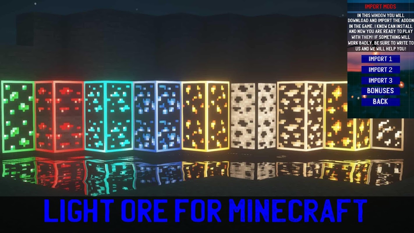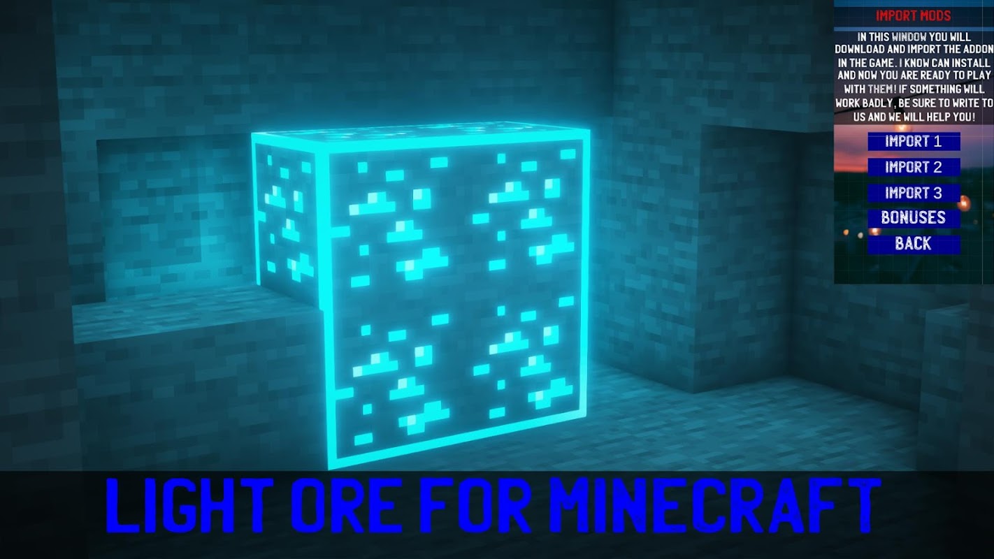 😋 Light Ore Mod for Minecraft PE will add mods which contains variety of light ores that will illuminate your cave and help you find valuable ores. Play with this addon in the MCPE world! 😀