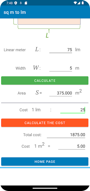 Chuyển đổi mét tuyến tính thành mét vuông và mét vuông thành tuyến tính.