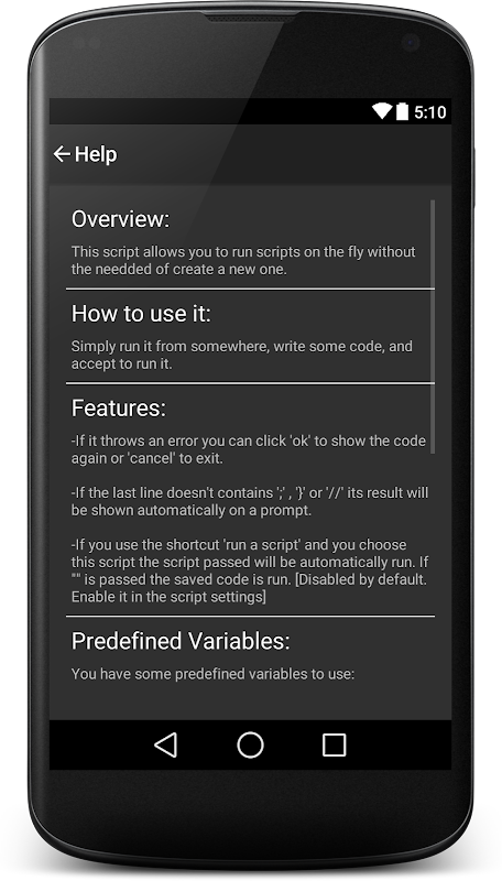 Ứng dụng này cũng chứa danh sách các tính năng của script và cách sử dụng chúng.