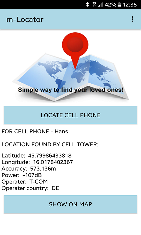 Đối với mục đích thử nghiệm, bạn luôn có thể thêm vào danh bạ điện thoại Location Droid cùng số điện thoại cho người yêu cầu và để theo dõi điện thoại di động và ứng dụng Location Droid sẽ tìm vị trí của điện thoại di động của bạn!