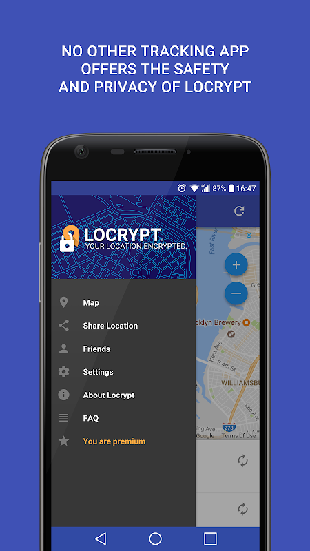 Ni Locrypt ni personas ajenas a tu grupo conocerán la localización de ninguno de los miembros, pues la localización está encriptada de punto a punto, con una encriptación AES 256.