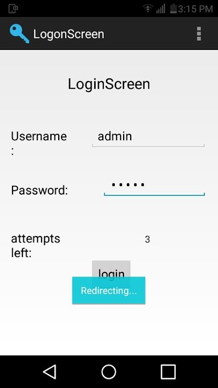 In This App you will login in panel If you will write username and password so you can see Redirecting.If you will write wrong username and password so you can see Wrong Credentials.The Logon screen panel username is admin and password is admin.