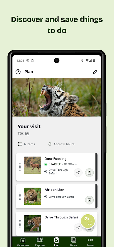 - Đừng bỏ lỡ một giây phút nào. Bạn đang muốn tận hưởng chuyến tham quan Ngôi nhà? Bạn đang hy vọng được lên xe buýt Safari của chúng tôi? Hãy xem bảng kế hoạch trong ngày để biết những gì đang diễn ra ở công viên suốt cả ngày và thậm chí đặt cho mình những lời nhắc hữu ích.