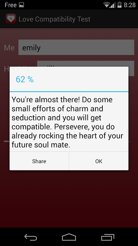 Bạn chỉ cần khởi động ứng dụng, nhập tên của bạn và tên của soulmate thể của bạn, bấm vào bắt đầu và calcul được đưa ra. Vài giây sau bạn có được kết quả khả năng tương thích của bạn.