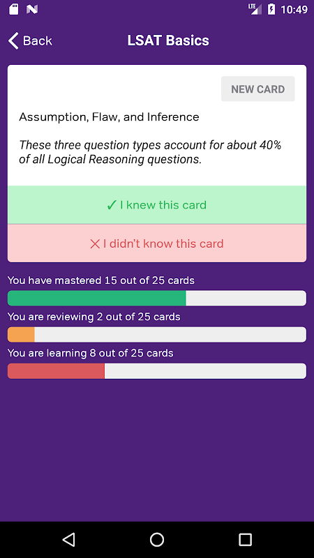 ứng dụng thực hành LSAT này bao gồm Flashcards LSAT rằng theo một thuật toán dựa trên các kỹ thuật Spaced lặp lại. Các Spaced Lặp Kỹ thuật xuất phát từ nghiên cứu khoa học, trong đó cho thấy rằng các ký ức được hình thành bởi sự tiếp xúc lặp đi lặp lại với thông tin mới trong khoảng thời gian khác nhau. Khi bạn thực hành với các Flashcards LSAT, bạn sẽ nhận thấy rằng Flashcards được đánh dấu là "làm chủ", "xem xét" hoặc "học tập". Thẻ mà bạn đang "học tập" sẽ xuất hiện thường xuyên nhất, cho đến khi bạn làm chủ chúng, và sau đó họ sẽ xuất hiện ít thường xuyên để bạn có thể tiếp tục xem xét các Flashcards LSAT.