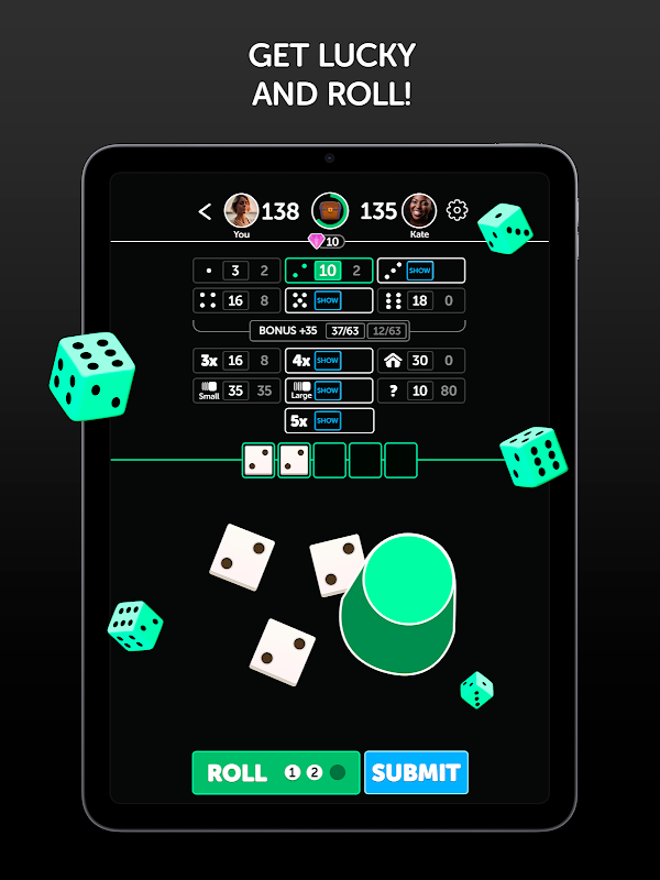 - Lăn và chiến thắng: Chơi trò chơi xúc xắc cổ điển của Yatzy với một bước ngoặt của Lucky Rollers!