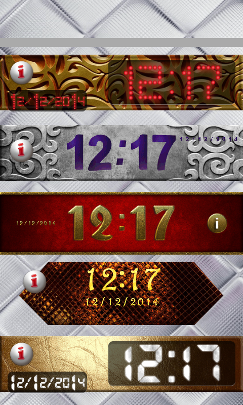 Ăn mặc điện thoại của bạn trong một thiết kế sang trọng đáng kinh ngạc. Nó đơn giản, nhanh chóng và thú vị! Chọn từ các lựa chọn rộng của chúng tôi đồng hồ kỹ thuật số. Phụ tùng miễn phí này cung cấp cho bạn đồng hồ vuông, đồng hồ đa giác, đồng hồ hình tròn và nhiều đồng hồ có kích thước và hình dạng khác nhau. Nhận ✷Widget Đồng Hồ Sang Trọng ✷ và làm đẹp cho màn hình chủ của bạn với nhiều đồng hồ luxy thiết kế đặc biệt cho thương hiệu widget mới.