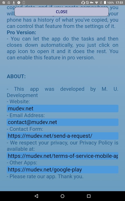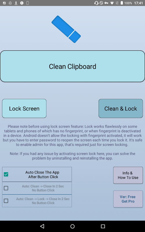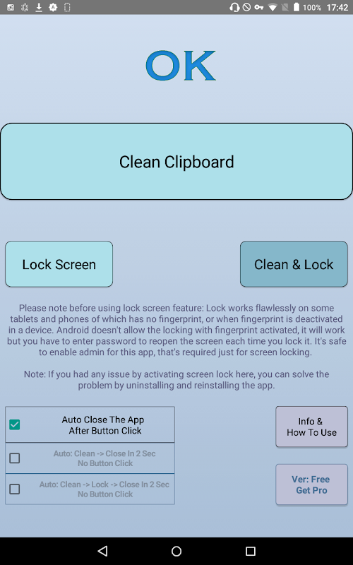 - Xóa bảng nhớ tạm: Khi bạn truy cập web và sử dụng các ứng dụng khác nhau có quyền truy cập vào tài nguyên của thiết bị, bạn sẽ không muốn bất kỳ dữ liệu cá nhân nào luôn ở trong bảng nhớ tạm của mình. Sử dụng ứng dụng này để dọn dẹp clipboard dễ dàng bất cứ lúc nào. Chúng tôi không thu thập bất kỳ thông tin nào thông qua ứng dụng này, nó cũng chỉ hoạt động ngoại tuyến, vì vậy dữ liệu clipboard sẽ được xóa một cách an toàn.