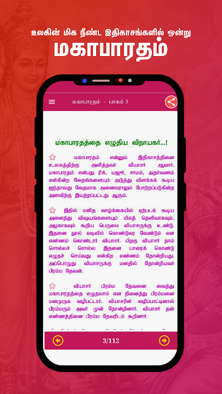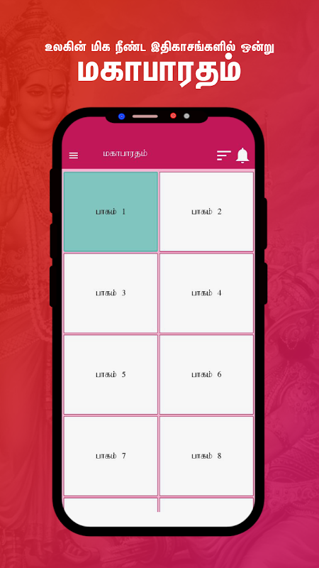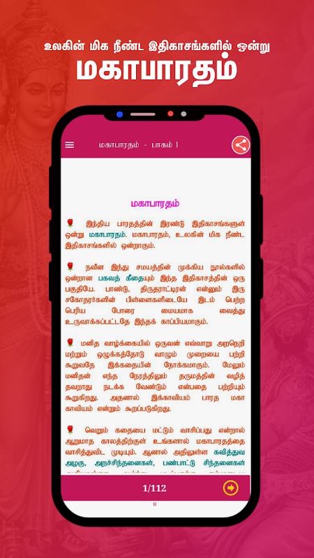Trải nghiệm các nhân vật hấp dẫn trong sử thi, cuộc đấu tranh và chiến thắng của họ, tất cả đều được thuật lại bằng ngôn ngữ Tamil xinh đẹp. Từ những lời dạy triết học của Bhagavad Gita đến những câu chuyện ly kỳ về Pandavas và Kauravas, mọi khía cạnh của sử thi đều được trình bày chi tiết.