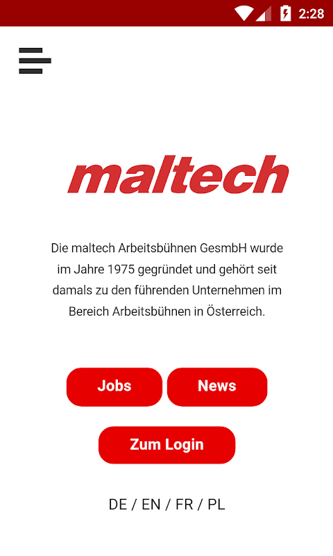 Maltech Arbeitsbühnen GesmbH được thành lập vào năm 1975 và kể từ đó trở thành một trong những công ty hàng đầu trong lĩnh vực nền tảng làm việc trên không ở Áo. Là một chuyên gia trong việc cho thuê, bán và dịch vụ của các nền tảng làm việc, maltech có năm chi nhánh trên khắp Áo.