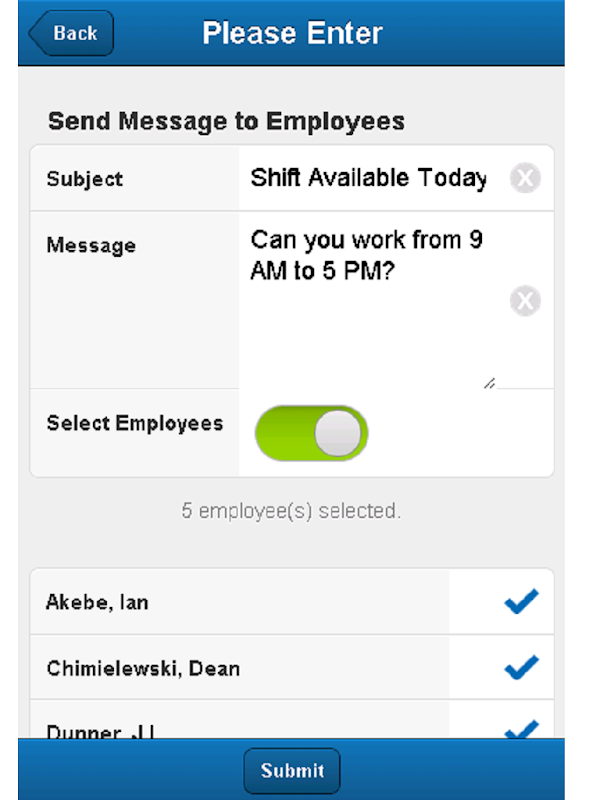 Với quản lý điện thoại di động, bạn có thể nhận và trả lời thông báo thời gian thực về nhân viên gọi-in và không cho thấy. Bạn cũng có thể xem xét, điều chỉnh và phê duyệt thẻ thời gian nhân viên, quản lý các yêu cầu nghỉ phép và lịch trình, và các nhân viên liên hệ trực tiếp qua điện thoại di động, giọng nói, hoặc tùy chọn văn bản.