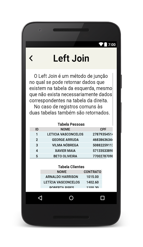 Hướng dẫn SQL là một ứng dụng cho những người dùng muốn tìm hiểu về SQL hoặc những người đã có một số kiến thức về nó. Có một kinh nghiệm nhanh chóng hiểu được các khái niệm về SQL, chọn Tham gia và các nguồn lực khác hiện có trong ngôn ngữ. Trong số các khái niệm thảo luận là: