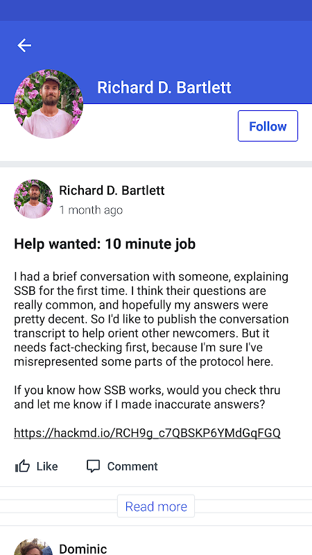 Manyverse is a social network app using the SSB protocol (Secure Scuttlebutt) where you can write posts and share with friends nearby or over the internet. It's different from mainstream social networks because your data is yours, it lives on your phone, not in the cloud. So there is no login, no company holding your data, no ads, no tracking of your activity, it's just you and your friends! The app is free and open source software, and it will always remain free.