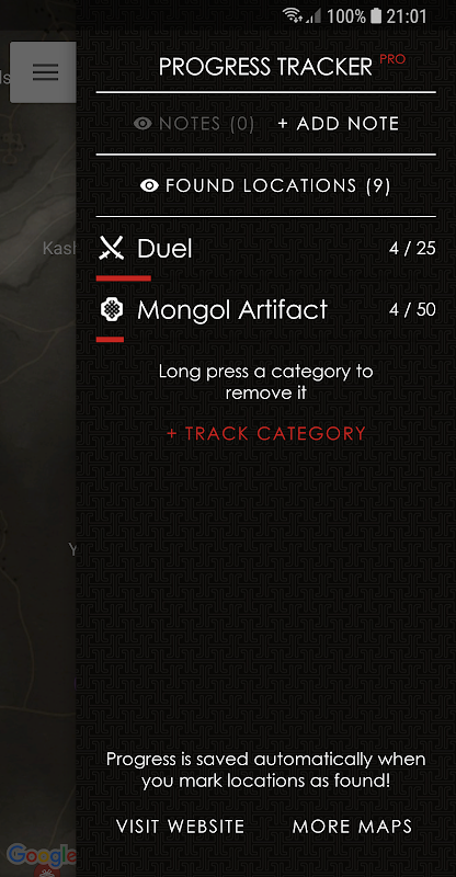 • Trình theo dõi tiến độ - đánh dấu các vị trí được tìm thấy và theo dõi tiến trình của các vật phẩm sưu tập của bạn.
