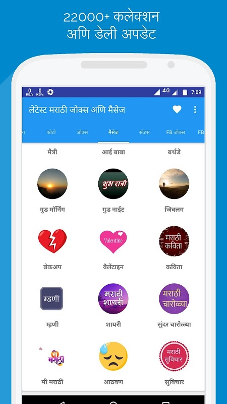 Messages: Prerna, Prem, Sairat, Premi, Tu ani Mi, Ukhane, Viral, Aayushya, Raje, Maitri, aai Baba, Birthday, Good Morning, Good Night, Jivlag, Breakup, Virah, Valentine, Kavita, Mhani, Shayari, Charoli, Mi Marathi, Aathvan, Suvichar