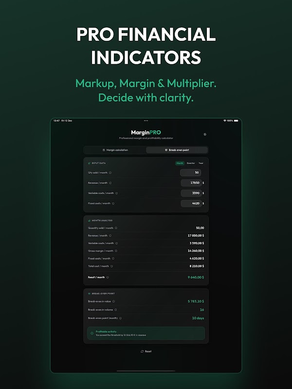 Khác với các ứng dụng khác, MarginPro không chỉ đưa ra kết quả: nó mang lại cho bạn cái nhìn rõ ràng về sức khỏe tài chính thông qua các chỉ số chính xác.