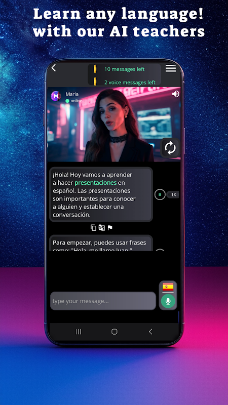 Bạn đang tìm cách tốt nhất để luyện tập và cải thiện kỹ năng ngôn ngữ của mình? Gặp gỡ giáo viên AI cá nhân của bạn! Ứng dụng của chúng tôi cho phép bạn trò chuyện, nói và học theo cách thú vị và tương tác, bao gồm hàng trăm chủ đề bằng nhiều ngôn ngữ (tiếng Anh, tiếng Tây Ban Nha, tiếng Hindi, tiếng Hàn, tiếng Nhật, tiếng Tamil, tiếng Telugu, tiếng Pháp, tiếng Đức, tiếng Bồ Đào Nha, tiếng Ý, tiếng Ả Rập, tiếng Do Thái, tiếng Hà Lan, tiếng Ba Lan, tiếng Nga, tiếng Ukraina, tiếng Thái, tiếng Philippines, tiếng Urdu, tiếng Uzbek, tiếng Swahili, tiếng Việt, tiếng Trung và nhiều ngôn ngữ khác). Cho dù bạn là người mới bắt đầu hay người học nâng cao, đây là công cụ tất cả trong một giúp bạn tăng khả năng nói trôi chảy với các cuộc trò chuyện AI theo thời gian thực.