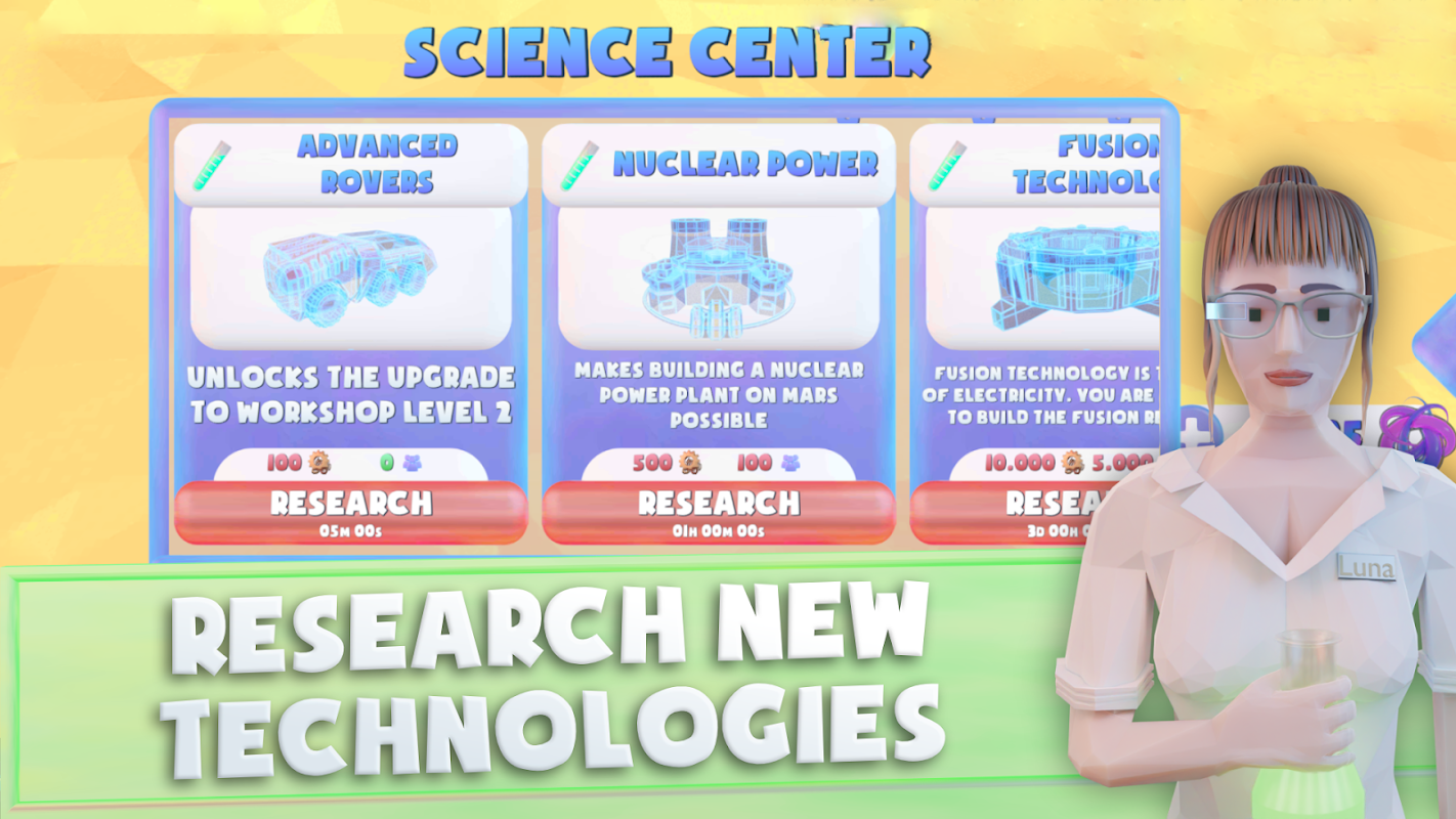 Nâng cấp hoặc mở khóa Rovers mới để khám phá Sao Hỏa trong các Chuyến thám hiểm thú vị và thu thập cũng như nghiên cứu Mẫu đá.