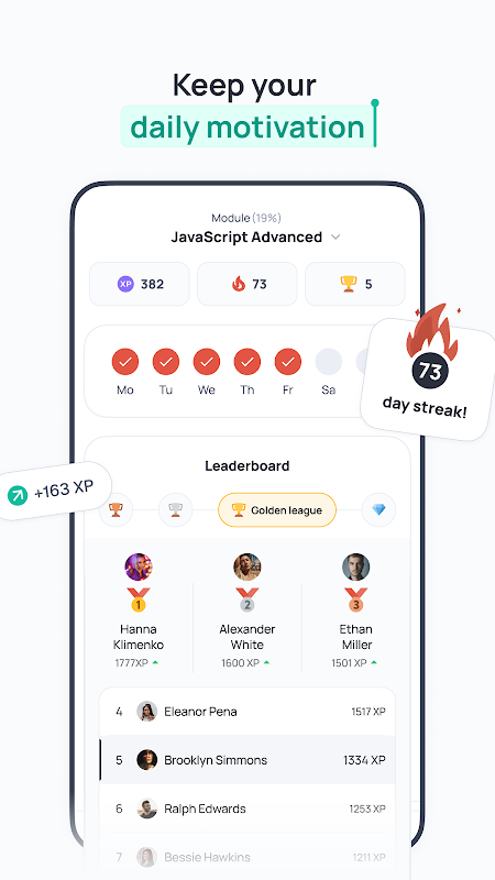 Chuỗi, XP và bảng xếp hạng giúp tiến trình trở nên thú vị — và vâng, có một chút cạnh tranh.