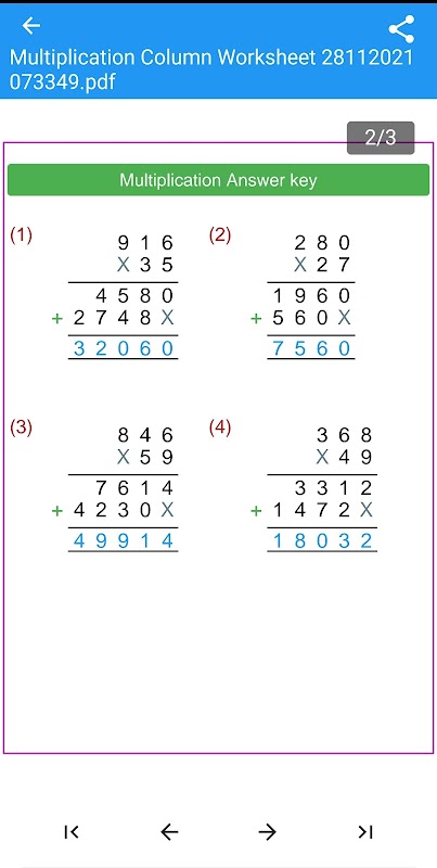 Ứng dụng này giải quyết tổng phép nhân trong phương pháp dài hoặc phương pháp cột. Ứng dụng này cũng được thiết kế để tạo bảng tính nhân ở dạng pdf có thể in được. Ứng dụng này có thể tạo bảng tính pdf với các phím trả lời.