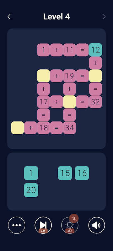 Lưới sẽ có các phương trình toán học được biểu diễn theo định dạng kiểu ô chữ. Ví dụ: bạn có thể thấy một gợi ý theo chiều ngang như "8 + ? = 10" hoặc một gợi ý theo chiều dọc như "4 × ? = 16." Người chơi phải kéo số chính xác vào ô tương ứng để giải phương trình. Lưới ô chữ đảm bảo rằng người chơi sử dụng lý luận logic để tìm ra vị trí phù hợp cho từng số.