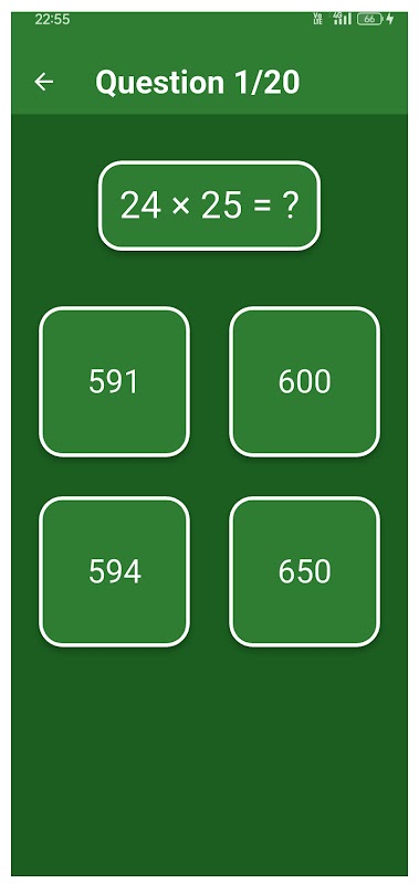 ✔ Các loại câu hỏi – Luyện tập phép cộng (+), phép trừ (−), phép nhân (×) và phép chia (÷) với menu lựa chọn đơn giản.