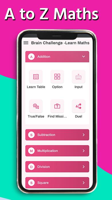 Learn maths by options: Whether you want to learn addition; subtraction; multiplication; division; squa4e; square root or something else you can play it as a game. You will learn maths by enjoying it. There is an option for everything. You choose the options and the app will tell you whether you are right or wrong.